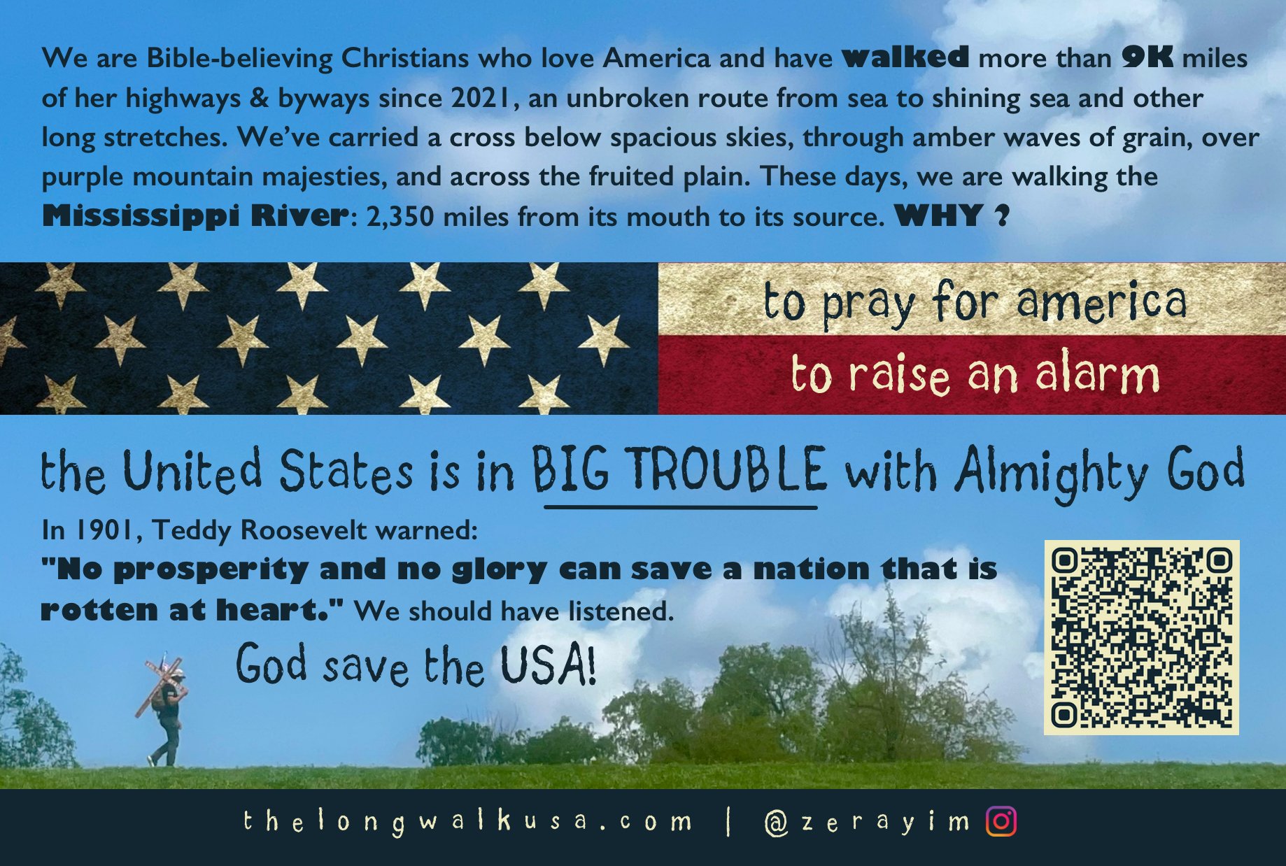 On 3.1.2021, we got our feet wet in the Atlantic Ocean off Cape Hatteras, North Carolina and began walking the LENGTH (#TheLongWalkUSA) of the United States with a CROSS and an American flag in distress. 8,118 miles later, we reached the Pacific Ocean in Northern California (10.10.2024). Along an unbroken route across 20 states and 251 counties, we sounded an alarm, the same alarm sounded by Teddy Roosevelt at the turn of the 20th century: