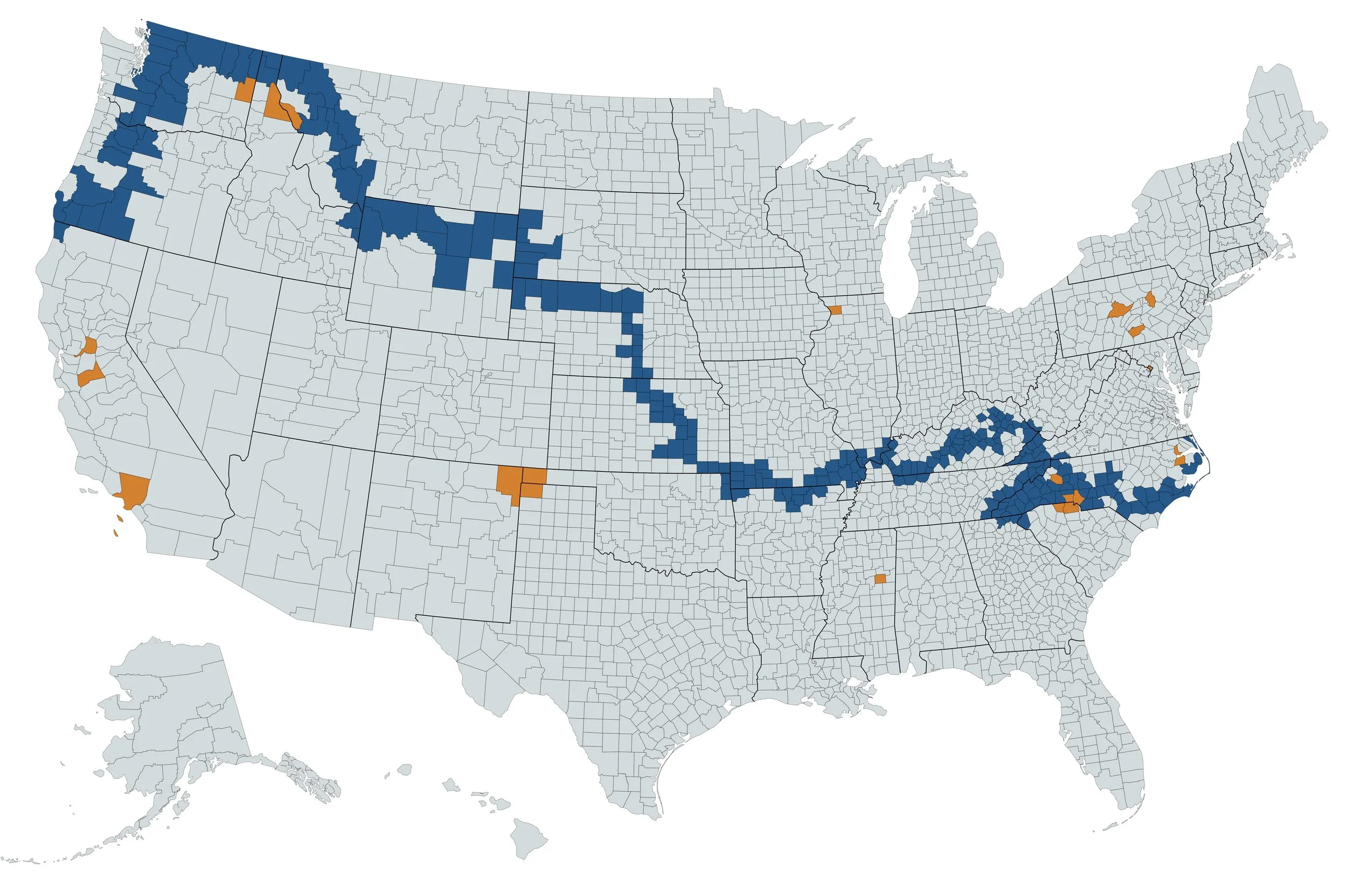 251 Main Route Counties (BLUE); 25 Additional Spur Route Counties (ORANGE)