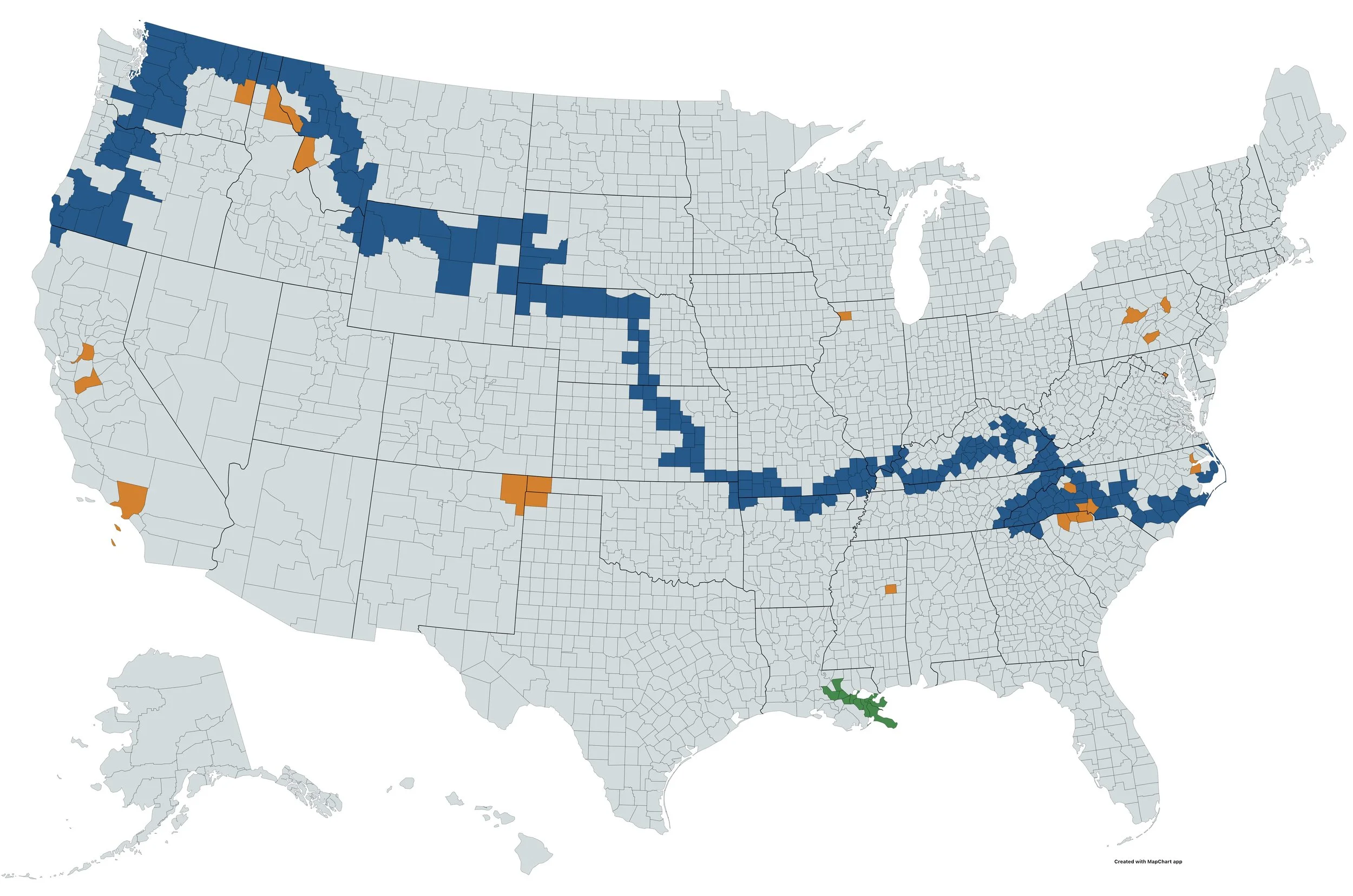 BLUE—Main Route Counties | GREEN—Big River Route Counties | ORANGE—Additional Spur Route Counties